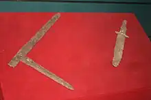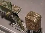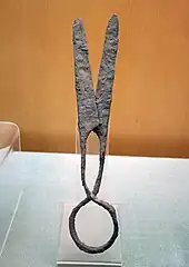 Donald B. Wagner escribe que la mayoría de las herramientas y útiles domésticos de hierro producidos durante la dinastía Han estaban hechos de hierro fundido, más barato y quebradizo, mientras que en el ámbito militar se prefería emplear armas de hierro forjado y acero debido a sus mejores cualidades y mayor duración.[25] Durante la dinastía Han, la típica espada de bronce de medio metro de longitud habitual de los reinos combatientes fue reemplazada gradualmente por una espada de hierro que medía aproximadamente 1 m de largo.[26] La antigua daga-acha de bronce (ge) todavía la usaban los soldados Han, aunque fue gradualmente reemplazada por lanzas de hierro y alabardas ji de hierro.[27] Incluso las puntas de flecha, que tradicionalmente estaban hechas de bronce, gradualmente pasaron a tener una punta de bronce y un eje de hierro, hasta el final del período Han cuando toda la punta de la flecha estaba hecha únicamente de hierro. Los agricultores,[27] los carpinteros, los artesanos del bambú, los canteros y los albañiles tenían a su disposición herramientas de hierro como rejas de arado, picos, espátulas, palas, azadas, hoces, hachas, azuelas, martillos, cinceles, cuchillos, sierras, leznas y clavos.[28] Los productos de hierro comunes que se encuentran en las casas de la dinastía Han incluyen trípodes, estufas, útiles de cocina, hebillas de cinturón, pinzas de depilar, pinzas de parrilla, tijeras, cuchillos de cocina, anzuelos y agujas.[27] Espejos y lámparas a menudo estaban hechos de bronce o hierro.[29] Durante la etapa Han se acuñaron monedas de cobre y de bronce (cobre aleado con estaño).[30]