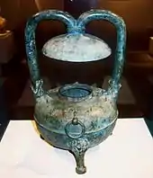Los inventos del artesano e ingeniero mecánico Ding Huan (丁緩) se mencionan en las Notas varias sobre la capital occidental.[52] El funcionario y poeta Sima Xiangru (179-117 a. C.) insinuó una vez en sus escritos que los chinos usaban un pebetero en forma de suspensión cardán, un soporte de pivote hecho de anillos concéntricos que permitían que el cardán central rotante permaneciera en posición vertical.[53] Sin embargo, la primera mención explícita del cardán utilizado como quemador de incienso data de alrededor del año 180, cuando el artesano Ding Huan creó su 'Quemador de perfume para usar entre cojines' que permitía quemar incienso colocado dentro del cardán central para permanecer constantemente nivelado incluso cuando se movía.[54] Ding también ideó otros inventos. Con el propósito de acondicionar el aire en interiores, instaló un gran ventilador operado manualmente que tenía ruedas giratorias de 3 m (9,8 pies) de diámetro.[55] También inventó una lámpara a la que llamó 'incensario de colina de nueve pisos', ya que tenía forma de montaña.[56] Cuando se encendía la lámpara cilíndrica, la convección de las corrientes ascendentes de aire caliente hacían girar las paletas colocadas en la parte superior, que a su vez hacían girar figuras de papel pintadas de pájaros y otros animales alrededor de la lámpara.[56]
