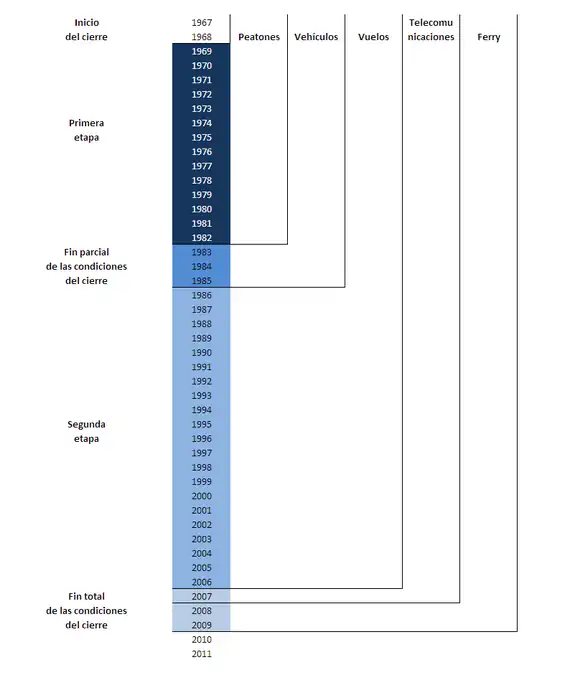 Se puso fin al bloqueo para el tránsito de peatones el 14 de diciembre de 1982, siete años después de la muerte de Franco, al inicio de la presidencia española de Felipe González. Terminaban así 13 años de bloqueo terrestre y aislamiento del Peñón,[17] en la acción más hostil por parte de España hacia Gibraltar desde el sitio de Gibraltar entre 1779 y 1783. Tras esta primera apertura al tránsito de peatones, permanecieron sin embargo el resto de restricciones establecidas en junio de 1969. Se produjo entonces un nuevo acuerdo hispano-británico, la Declaración de Bruselas del 27 de noviembre de 1984, firmada por el Ministro de Asuntos Exteriores de España, Fernando Morán, y el Secretario de Relaciones Exteriores del Reino Unido y de la Commonwealth, Geoffrey Howe, con el objeto de implementar lo acordado en la Declaración de Lisboa de 1980. De forma progresiva, se ampliaron las condiciones de circulación, pero pasarían sin embargo décadas hasta el restablecimiento de algunas otras de las formas de comunicación cortadas en 1969.