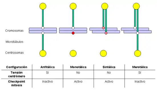 - sintélica: las dos cromátidas hermanas se anclan a MT que proceden del mismo polo; esta situación tampoco genera tensión centromérica, con lo cual se activa el checkpoint de mitosis. Si no se corrige, ambas cromátidas se dirigirán a la misma célula hija, generando una situación de aneuploidía.