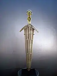 Espada de hoja corta y pesada de entre 35 y 60 cm de longitud y de cinco dedos de ancho en la empuñadura. La hoja presenta unas características acanaladuras en ambas caras de la misma. Guarnición corta arqueado hacia la hoja. La empuñadura es sencilla pero decorada con cachas de marfil fijados mediante remaches huecos calados. El ancho de su hoja dejaba lugar a una esmerada y profusa decoración.
