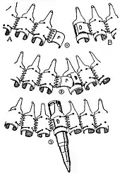 Aunque las tejas de alimentación fueron reemplazadas en la mayoría de los ejércitos por ametralladoras que usan cintas o cargadores, el diseño de la teja de alimentación de Hotchkiss fue pionero en un mecanismo de cinta de 50 cartuchos, compuesto por piezas articuladas de metal unidas, parecidas a las cintas de alimentación. El diseño de la cinta articulada Hotchkiss se remonta a 1896.[1]
