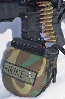 Las cintas flexibles tienden a colgar hacia abajo por la gravedad y sacudirse aleatoriamente con el retroceso durante el disparo continuo, y puede doblarse/plegarse y causar fallas en la alimentación. Las cintas que cuelgan libremente también pueden ensuciarse con la exposición a los elementos, entorpecer su manejo y enredarse con otros objetos, especialmente cuando el tirador intenta maniobrar. Para minimizar tales problemas, las cintas de municiones a veces se llevan en contenedores diseñados para ser conectados al arma de fuego, ya sea insertándolos como un cargador de tambor o simplemente montados convenientemente a un lado (para sistemas de armas más grandes). Cuando se cargan municiones, un extremo de la cinta se saca a través de una abertura en el contenedor y se inserta en el arma normalmente, saliendo la cinta del contenedor de manera controlada. Estos contenedores también suelen tener una barra de apoyo/guía que permite que la cinta entre en el arma en un ángulo óptimo (más perpendicular), en lugar de inclinarse bruscamente.