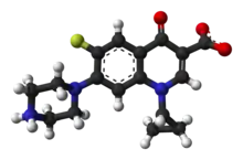El ciprofloxacino[1] es un antibiótico del grupo de las fluoroquinolonas con efectos bactericidas. Su modo de acción consiste en paralizar la replicación bacterial del ADN al unirse con una enzima llamada ADN girasa, que queda bloqueada. La función de la ADN girasa es deshacer el superenrollamiento de la doble cadena de ADN, permitiendo que otras enzimas puedan proceder a la replicación propiamente dicha. La bacteria queda incapacitada para dividirse y finalmente muere.