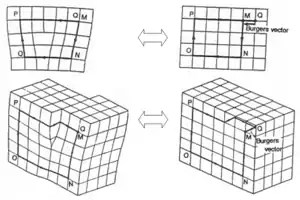 El circuito de Burgers se trata de un camino cerrado que va de átomo a átomo rodeando (e incluyendo) la línea de dislocación. Para construir este circuito se van trazando saltos de átomo a átomo de tal manera que en cada dirección haya tantos saltos atómicos como en la dirección opuesta. Si el circuito no cierra ninguna dislocación, el punto final y el inicial coinciden. Si no coinciden, podemos asegurar que estamos encerrando al menos una dislocación.