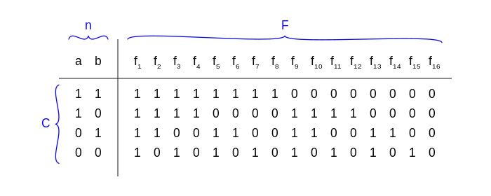 Para componer una tabla de verdad, pondremos las n variables en una línea horizontal, debajo de estas variables desarrollamos las distintas combinaciones que se pueden formar con 1 y 0, dando lugar a las distintas C, número de combinaciones. Normalmente solo se representa la función para la que se confecciona la tabla de verdad, y en todo caso funciones parciales que ayuden en su cálculo, en la figura, se pueden ver todas las funciones posibles F, que pueden darse para el número de variables dado.