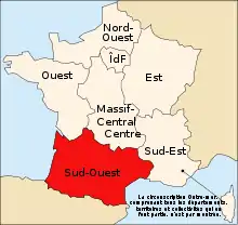 La Circunscripción del Suroeste es una circunscripción electoral francesa utilizada cada 5 años desde 2004 durante las Elecciones al Parlamento Europeo para designar, mediante una elección de sufragio universal directo, 10 de los 72 eurodiputados (78 en 2004) que le corresponden a Francia según el Tratado de Niza de los 736 miembros del Parlamento Europeo. Fue creada en 2003 mediante la Loi Électorale n° 2003-327 del 11 de abril de 2003.,[1] como las otras 7 circunscripciones electorales francesas para las elecciones europeas.