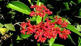 Inflorescencia umbelada de color rojo brillante y ardiente, similar al de las flores mismas. Flores pequeñas con cuatro partes rojas, de 4 a 5 mm de ancho, cáliz copular. Los pétalos salvados rojos de 1 a 1.5 mm de largo están enganchados en el extremo.