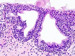 ![]() Histopatología de una cistitis glandular en una biopsia citoscópica. Tinción con hematoxilina y eosina. | ||