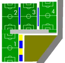 Las instalaciones cuentan con vestuarios, almacenes para material, gimnasio, zonas de aparcamiento y una sala de prensa.