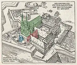La Peterskirche, la iglesia del monasterio de 75 metros de longitud, se construyó entre 1103 y 1147. Originalmente tenía dos torres en su extremo este, que junto con las torres de la catedral de Erfurt y la Severikirche, dominaban el perfil de la ciudad. Hasta finales del siglo XIII, los emperadores del Sacro Imperio Romano Germánico y los reyes alemanes solían celebrar sus cortes en la iglesia. También se celebraban allí sínodos eclesiásticos.[11] En noviembre de 1181 tuvo lugar en la iglesia una Dieta Imperial, que presidió el emperador del Sacro Imperio Romano Germánico Federico I, conocido como Barbarroja. Allí, Enrique el León, primo de Barbarroja, se sometió a la autoridad del emperador tras varios años de oposición y guerra, y cedió la mayor parte de sus tierras.[3][21]