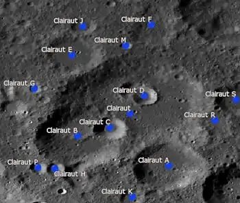 Por convención estos elementos son identificados en los mapas lunares poniendo la letra en el lado del punto medio del cráter que está más cerca de Clairaut.