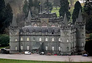 - Inveraray Castle en Argyll es la sede actual del Jefe de Clan Campbell.[27] La mansión simétrica actual con torres y torretas fue construida en 1743 y reemplazó un castillo anterior del siglo XV. Contiene una "sala del clan" con información para miembros de Clan Campbell.