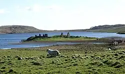 - Finlaggan Castle, ubicado en Loch Finlaggan, enIslay. Fue la sede del jefe de Clan Donald, Señor de las Islas.[41][42]