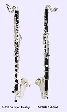 La forma del clarinete bajo recuerda a la de un saxofón tenor, pero con dos diferencias: el cuerpo es cilíndrico en vez de cónico, y el material es la madera, (en concreto ébano), en vez de latón.