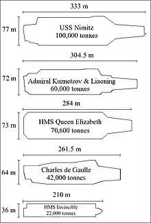 Los buques desplazan unas 70 600 toneladas, más de tres veces el desplazamiento de la actual clase Invencible. Son los buques de guerra más grandes jamás construidos en el Reino Unido y los portaaviones más eficaces, a excepción de los de la Marina de Estados Unidos.[25] Nada a tan gran escala ha sido propuesto para la Royal Navy desde el programa de los CVA-01 cancelado en los años 1960. Dando pruebas a la Comisión de Defensa de la Cámara de los Comunes, el primer Lord del Mar el Almirante Sir Alan West, explicó que la interoperabilidad con la Armada de Estados Unidos US Navy, fue un factor para decidir el tamaño de los portaaviones así como la potencia de fuego del grupo aéreo: