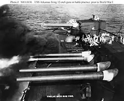 De inicios de 1932 a inicios de 1934, el Arkansas regresó a la flota del Pacífico, seguido por otro viaje por Europa a finales de año. Después del estallido de la Segunda Guerra Mundial en septiembre de 1939, fue asignado a la fuerza de reserva para las Patrullas de Neutralidad. Apoyó en la ocupación de Islandia en julio de 1941 como escolta de convoyes de buques de tropas. En noviembre, cuando se hizo cada vez más evidente que los Estados Unidos entrarían a la guerra, el Wyoming fue reasignado como una embarcación de entrenamiento de artillería, papel en que sirvió el resto de la guerra. Mientras tanto, el Arkansas continuó en servicio en la primera línea durante la guerra, primero como escolta de convoyes hacia África del Norte, y después como embarcación de bombardeo costero. Apoyó en los desembarcos de Normandía en junio de 1944, disparando contra posiciones alemanas en la playa de Omaha, antes de bombardear Cherburgo a finales de ese mismo mes. Su siguiente misión de bombardeo fue en la operación Dragoon, la invasión al sur de Francia en agosto de ese año. Después fue transferido al teatro de operaciones del Pacífico para combates contra fuerzas japonesas. Bombardeó las posiciones de Iwo Jima en febrero de 1945, y de Okinawa en abril.