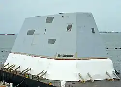 El destructor de la clase Zumwalt reintroduce la forma de casco tumblehome, una forma de casco que no se había visto hasta este punto desde la guerra Ruso-Japonesa en 1905. Originalmente, el astillero francés Forges et Chantiers de la Méditerranée en La Seyne, Tolón. Los arquitectos navales franceses creían que la casa rodante, en la que la manga del barco se estrechaba desde la línea de flotación hasta la cubierta superior, crearía un mejor francobordo, una mayor navegabilidad y, como iban a encontrar los acorazados rusos, sería ideal para navegar a través de restricciones estrechas (por ejemplo, canales).[58] En el lado negativo, los acorazados de casas rodantes tenían fugas, en parte debido a su construcción remachada, y podían ser inestables, especialmente cuando giraban a alta velocidad.[59] La casa rodante se reintrodujo en el siglo XXI para reducir el retorno de radar del casco. La proa invertida está diseñada para atravesar las olas en lugar de cabalgar sobre ellas.[57][60] La estabilidad de esta forma de casco en estados de alta mar ha provocado un debate entre los arquitectos navales, y algunos afirman que "con las olas que vienen desde atrás, cuando un barco se inclina hacia abajo, puede perder estabilidad transversal como el popa sale del agua y básicamente se da la vuelta".[61]