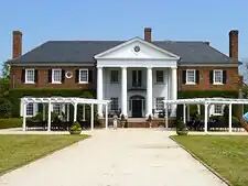 Un ejemplo principal de la arquitectura georgiana en las casas de plantadores es la plantación Westover, construida a mediados del siglo XVIII como residencia de William Byrd III, el hijo del fundador de Richmond, Virginia. Una puerta elaborada, que se reconoce como «la puerta Westover», adorna la entrada principal y contrasta con una construcción por lo demás simple.[8][9] Durante la guerra civil estadounidense, la casa sirvió como sede del general de la Unión Fitz John Porter, el protegido de George McClellan, que estaba destinado en la cercana plantación Berkeley, y, supuestamente, tuvo su ala este golpeada por una bala de cañón confederada disparada desde el lado sur del río James. El ala se incendió y quedó en ruinas hasta que la señora Clarise Sears Ramsey, descendiente de Byrd, compró la propiedad en 1899. Jugó un papel decisivo en la modernización de la casa, la reconstrucción del ala este y la adición de uniones para conectar la casa principal con la que antes estaba separada. dependencias, creando así un edificio largo.[8]