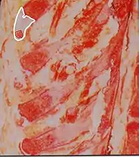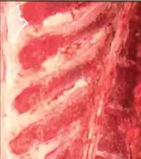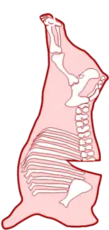 La clasificación de la carne se refiere a la práctica de evaluación de la carne en relación con sus atributos organolépticos de calidad. Dependiendo de la normatividad en cada país la blandura, jugosidad y frescura de la carne se evalúan mediante una estimación de su madurez (ósea, adiposa y muscular) y la cantidad de grasa presente. Como se muestra en la figura, en el ganado bovino la inspección se realiza sobre el ribeye localizado entre la costilla duodécima y la decimotercera de una canal.