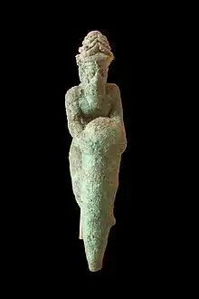Clavo de fundación de cobre con la figura de un dios de rodillas, poniendo un clavo, con una dedicación de Gudea a Ningirsu.