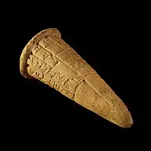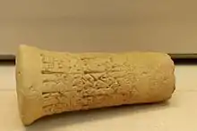 Clavo de fundación de arcilla dedicado por Entemena, rey de Lagash, al dios de Bad-Tibira, c. 2400 a. C..