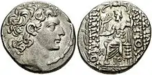 - Antíoco XIII: este hijo es el Antíoco de Cicerón,[117] quien, como monarca después de la muerte de su madre, aparece en sus monedas como Antíoco Filadelfo («amante de los hermanos»), pero en las monedas donde Cleopatra Selene está representada junto con su hijo gobernante, el rey se llama Antíoco Filométor («amante de la madre»). Esto ha llevado a los estudiosos a proponer varias teorías: Kay Ehling, concordó con Bouché-Leclercq, y afirmó que Cleopatra Selene tuvo dos hijos, ambos llamados Antíoco.[67] Pero de Cicerón, que dejó sin nombre a uno de los hermanos, se desprende claramente que solo uno de ellos se llamaba Antíoco;[115] para que la propuesta de Ehling fuese válida, Antíoco Filómero debería ser el Antíoco mencionado por Cicerón, debería haber muerto y su hermano, que tenía un nombre diferente, hubiese tenido que asumir el nombre dinástico de Antíoco con el epíteto Filadelfos, pero esta posibilidad es complicada y sigue siendo una mera hipótesis.[117] Así, Antíoco XIII tenía dos epítetos: Filadelfo y Filómero.[119]