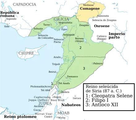 En el norte, Filipo I gobernó hasta su muerte, después de lo cual Cleopatra Selene reclamó los derechos de sus hijos que había tenido con Antíoco X al trono vacante.[60] En general, los sirios no aceptaron las pretensiones de la reina, y el pueblo de Antioquía invitó a Tigranes II a gobernar Siria, frustrado por las constantes guerras civiles de los seléucidas.[76] Se debate el año en que tuvo lugar este acontecimiento; la mayoría de los estudiosos aceptan que fue en el 83 a. C. cuando falleció Filipo I, aunque no hay pruebas de ello, pero aceptan la afirmación de Apiano, quien asignó un reinado de catorce años a Tigranes II, que terminó en el 69 a. C.[77] Oliver D. Hoover propuso como hipótesis que Tigranes II invadió Siria en 74 a. C. y que Filipo I reinó en el norte de Siria hasta el año anterior, lo que hubiese creado un lapso de tiempo en el que Cleopatra Selene y Antíoco XIII hubiesen podido reclamar la posesión del país sin oposición. Un argumento a favor de que Cleopatra Selene y su hijo fuesen los únicos aspirantes al poder en Siria en el 75 a. C. es una declaración de Cicerón: el estadista romano escribió que la envió a Antíoco XIII y a su hermano a Roma en 75 a. C.[78] Los dos hermanos regresaron a Siria en 240 ES (73/72 a. C.),[79] tras haber reclamado el trono de Egipto en virtud de los derechos de su madre. Para impresionar al Senado romano, la reina hizo que sus hijos llevasen obsequios, entre ellos un candelabro con joyas engastadas que dedicaron en el templo de Júpiter capitolino.[70] El Senado se negó a tratar su petición acerca del trono egipcio, pero, según Cicerón, sí se les reconocía su derecho de iure al sirio, que habían heredado de sus antepasados.[80]