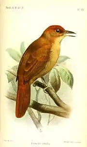 Mide entre 20 y 21 cm de longitud y pesa entre 44 y 51 g.[5] Exhibe un peculiar ojo amarillo brillante. El pico es robusto. El dorso es pardo claro, la corona y nuca rufo anaranjadas, como también las alas y la larga cola; por abajo es anteado.[6]