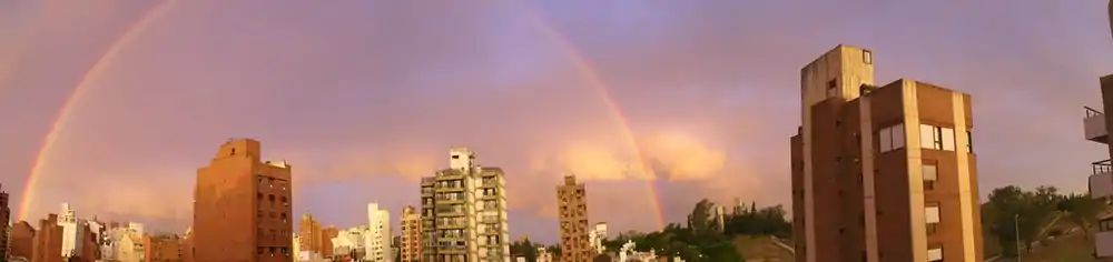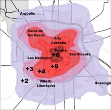 Por otra parte, dada la mediterraneidad, las variaciones o amplitudes térmicas son mayores que en la costa atlántica, siendo además menor la precipitación anual, de alrededor de 800 mm/año. En la ciudad la temperatura varia del día a la noche, pudiendo llegar hasta los -5 °C en las noches de invierno. Su temperatura media anual ponderada en todo el siglo xx fue de 18 °C. En enero, mes más cálido del verano austral, la máxima media es de 31,1 °C y la mínima media de 18,1 °C. En julio, mes más frío, las temperaturas medias son 18,6 °C de máxima y 5,5 °C de mínima. Aún en invierno pueden ser frecuentes días algo cálidos, debido a la influencia del viento Zonda.[3] Las nevadas son poco frecuentes, las últimas se registraron en 1984, 2007, 2009 y 2021.[4][5][6] Por su parte, los tornados son un evento climático relativamente habitual, ya que la ciudad se encuentra en la zona de América del Sur conocida como Pasillo de los Tornados. Se recuerdan tormentas como la de 2003, que causó severos daños en la periferia.[7]
