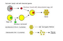 En la transferencia nuclear de células somáticas (SCNT por sus siglas en inglés) se extrae el núcleo de una célula somática de un donador y se trasplanta en un óvulo hospedero cuyo propio material genético ha sido eliminado previamente. Después de que el material genético de la célula somática donadora se transfiere al ovocito hospedero con una micropipeta, el material genético de la célula somática se fusiona con el óvulo aplicando una leve corriente eléctrica. Una vez que las dos células se hayan fusionado, la nueva célula se puede desarrollar dentro de una madre sustituta o artificialmente.[12] Este fue el proceso con el que se clonó exitosamente a la oveja Dolly .[3]