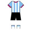 Uniforme titular: Camiseta con bastones verticales Blancos y Celestes y vivos en color Bordo, pantalón negro y medias negras.