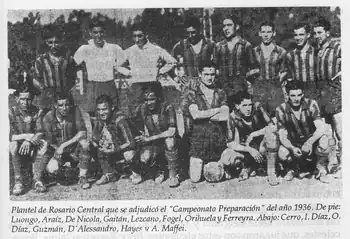 Al no haber una liga en la ciudad, entre 1900 y 1907 el primer equipo de Rosario Central participaba de la Copa de Competencia que organizaba la AFA contra clubes de Buenos Aires y Uruguay, siendo esta su primera división.[28] El 30 de marzo de 1905 se creó la Liga Rosarina de Fútbol, asociación encargada de organizar la primera competición de la provincia, con clubes de la ciudad de Rosario. La mencionada Liga tenía como principal objetivo la organización de un torneo, y para esto se consiguió una copa donada por el intendente de Rosario, Santiago Pinasco. Luego, en su honor, la competencia se denominó «Copa Santiago Pinasco», el cual fue un campeonato de segunda división.[29][30][31] En esta copa no podían participar aquellos jugadores que estuviesen disputado la «Copa Competencia». Esto afectó a Central, debido a que participaban con su primer equipo en esta copa nacional.[28]