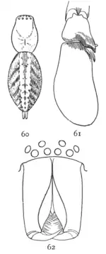 ![]() 60, espalda de hembra ampliada cuatro veces para mostrar marcas. 61, palpos de macho. 62, frente a la cabeza y mandíbulas de macho. | ||