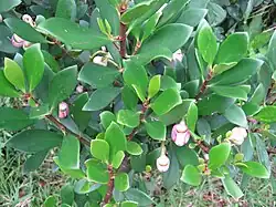 Las inflorescencias surgen en panículas cortas con flores de color rosado, más fuerte en la base de los pétalos, coriáceas, de consistencia como de cera o plástico. Sus frutos son cápsulas ovoides verdes inicialmente, pero amarillas al madurar.
