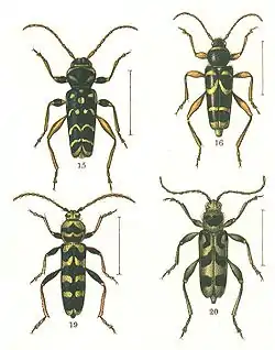 ![]() 15 Plagionotus arcuatus - 16 Clytus arietis - 19 Plagionotus floralis - 20 Anthoboscus herbsti | ||