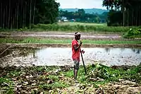 Un campesino hace hoyos con la coa para sembrar en el arrozal