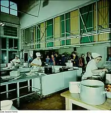 Las cocinas comerciales se encuentran en restaurantes, cafeterías, hoteles, hospitales, instalaciones educativas y laborales, cuarteles del ejército y establecimientos similares. Estas cocinas son generalmente más grandes y están equipadas con equipos más grandes y pesados que una cocina residencial. Por ejemplo, un restaurante grande puede tener un enorme refrigerador y una lavadora de platos comercial grande. En algunos casos, el equipo de cocina comercial, como los fregaderos comerciales, se usa en entornos domésticos, ya que ofrece facilidad de uso para la preparación de alimentos y alta durabilidad.[2][3] En los países desarrollados, las cocinas comerciales generalmente están sujetas a las leyes de salud pública. Son inspeccionados periódicamente por funcionarios de salud pública y obligados a cerrar si no cumplen con los requisitos de higiene exigidos por la ley.