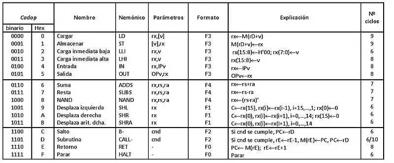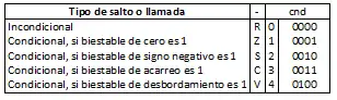 En la Figura 3, cada operando que comienzan por r representa un registro (r0 a rF), el operando v corresponde a un valor inmediato de 8 bits, y cnd hace alusión a un código de condición de salto o llamada a subrutina de acuerdo con los códigos que se dan en la Figura 4.