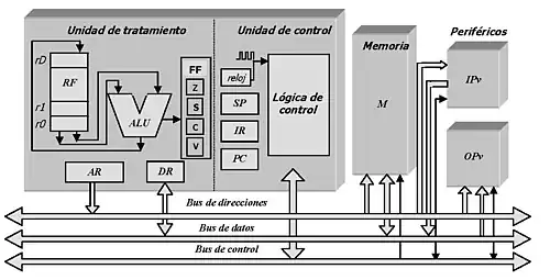 - Biestables indicadores (FF) para gestionar las instrucciones condicionales de salto o de llamadas a subprogramas. Se incluyen biestables de cero (Z), signo (S), acarreo (C) y desbordamiento (V).