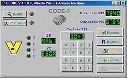 En la definición del repertorio de instrucciones máquina y en el desarrollo de CODE-2 colaboraron, con el profesor Prieto, los también profesores Antonio Cañas, Julio Ortega, Francisco Pelayo y Francisco Gómez Mula.[6][7] El alumno Antonio Martínez Álvarez (actualmente profesor de la Universidad de Alicante) se hizo cargo de la realización de un emulador y un ensamblador de CODE-2, así como de todo un entorno didáctico (denominado ECODE)[8] que permite comprobar el funcionamiento tanto externo como interno del computador, y que puede ser descargado como software libre.