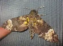 La longitud del sus alas delanteras es de 52 a 55 mm para machos y su envergadura es de 101 a 111 mm. El cuerpo y las alas son marrones, con dos pelos dorsales color de rosa brillante en la base del abdomen. Las alas anteriores están moteadas y abigarradas con líneas onduladas marrones y oscuras más claras. Las patas posteriores son más oscuras, con un remiendo basal negro rodeado por un remiendo ocre amarillo grande. Las hembras son más grandes y más oscuras. El área subapical de las alas anteriores es mucho más pálido y más visible.