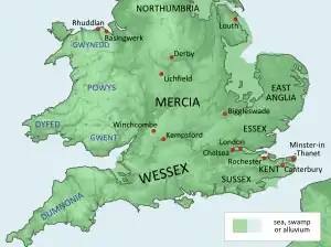 Durante la mayor parte del siglo VIII, Mercia era dominante entre los reinos anglosajones al sur del río Humber. Æthelbald, que llegó al trono en 716, se estableció como señor de los anglosajones del sur hacia 731.[1] Fue asesinado en 757, y sucedido brevemente por Beornred, pero al cabo de un año Offa lo derrocó y accedió al trono. Eadburh, hija de Offa, se casó con Beorhtric de Wessex en 789, y Beorhtric se convirtió en aliado.[2] En Kent, Offa intervino decisivamente en la década de 780 y en algún momento se convirtió en señor de Estanglia, cuyo rey, Æthelred, fue decapitado por orden de Offa en 794.[3][4]