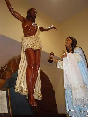 El grupo escultórico se compone de una figura de Jesús resucitado saliendo de una simbólica cueva con los brazos abiertos. Es característico el color oscuro de la imagen de Cristo, un reflejo de la imagen probable que tuviera Jesucristo frente a la imagen idealizada occidentalizada.