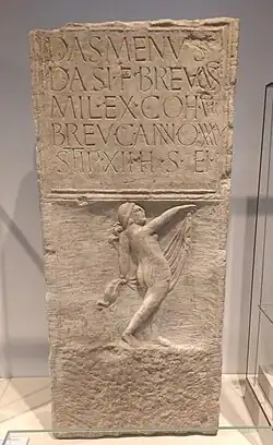![]() Epitafio de Dasmeno, hijo de Daso, breuco, soldado de la unidad en la primera mitad del siglo I. | ||