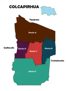 En la actualidad Colcapirhua consta de 5 distritos, distribuido a lo largo de su territorio.[2]