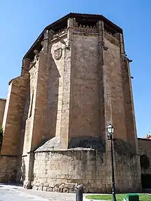 Exteriormente el ábside se presenta rematado por una interesante crestería calada de estilo hispano flamenco y pináculos desmochados que sirven de base a un tejado superpuesto. Antes de la reforma del edificio en el siglo XVII, en la que se desmocharon los pináculos, el edificio debía presentar una silueta semejante a la de la Cartuja de Miraflores, en Burgos.