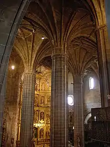 El coro ocupa el altura el último tramo de las tres naves, su lado izquierdo, también en altura, hay una prolongación en la que se ubica el órgano barroco. El piso del coro está apoyado sobre arcos escarzanos con decoración en grutescos platerescos. El acceso se realiza por una monumental escalera lateral de piedra con balaustrada decorada.