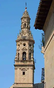 La torre del campanario se alza al lado de la puerta principal. Se levantó sobre otra anterior del siglo XVI. Su construcción data de 1756 finalizándose cuatro años después. La obra corrió de las manos de Martín de Beratúa y Martín de Arbe. Es una pieza barroca del denominado "estilo riojano similar a las de la catedral de Santo Domingo de la Calzada y de Logroño.