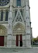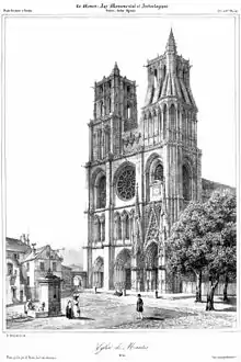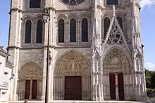 La fachada occidental está perforada por tres grandes portales esculpidos coronados por un rosetón, que están coronados por dos torres cuyo aspecto ha sido profundamente modificado por las restauraciones del siglo XIX. Este diseño está inspirado en el modelo de la Catedral de Laon. La portada central, dedicada a Santa María, sufrió graves daños durante la Revolución francesa.